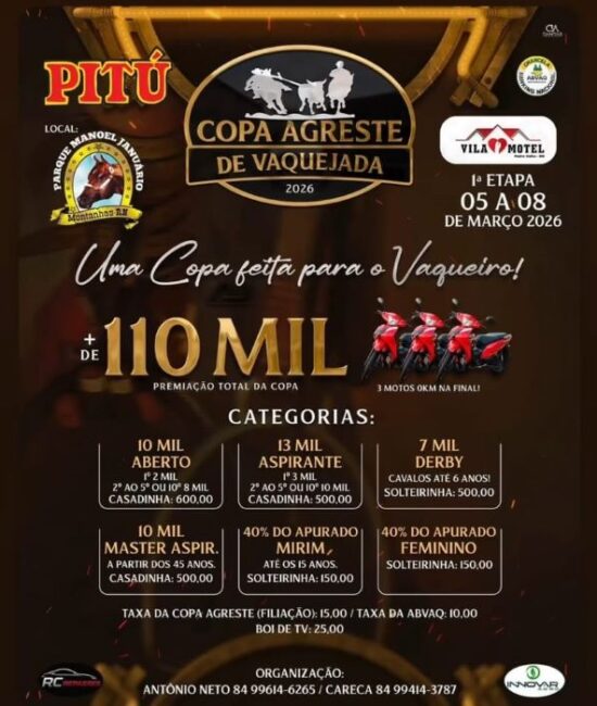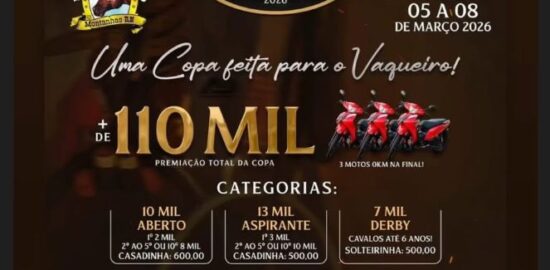 A 1ª Etapa da Copa Agreste de Vaquejada 2026 promete movimentar o Rio Grande do Norte entre os dias 05 e 08 de março, transformando a cidade de Montanhas no epicentro da cultura vaqueira. O evento será realizado no tradicional Parque Manoel Januário, combinando esporte e entretenimento com uma estrutura de alto nível. A competição destaca-se no calendário regional por sua atrativa premiação, que ultrapassa os R$ 110 mil em prêmios. A disputa atrai competidores e amantes do esporte de diversas cidades da Região Agreste e de estados vizinhos, reforçando a tradição do parque como um dos principais palcos da vaquejada no estado potiguar. Atrações Artísticas Além...
