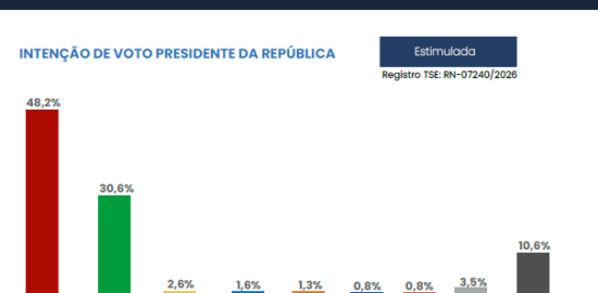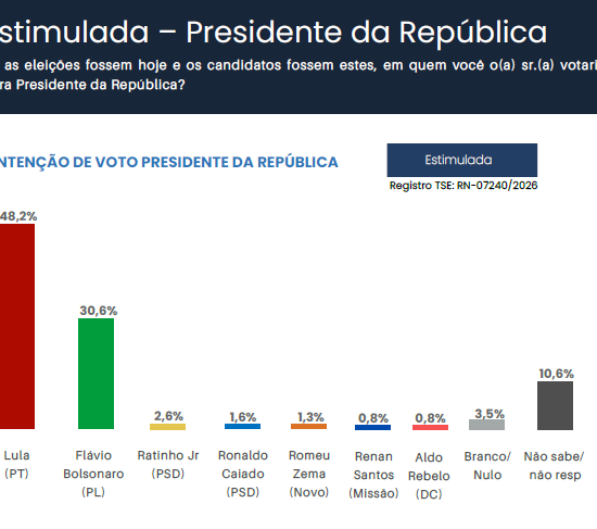 Levantamento do instituto Media Inteligência em Pesquisa questionou os eleitores do RN em quem eles votariam para presidente da República se as eleições fossem hoje. No cenário estimulado, Lula lidera com 48,2%, seguido por Flávio Bolsonaro com 30,6%. Na sequência vem Ratinho Jr (2,6%), Ronaldo Caiado (1,6%), Romeu Zema (1,3%), Renan Santos (0,8%) e Aldo Rebelo (0,8%). Branco e nulo somam 3,5% e outros 10,6% não sabem ou não responderam. A pesquisa foi realizada de 23 a 26 de março de 2026 e ouviu 2.000 eleitores, possui margem de erro de 2,2 pontos percentuais e nível de confiança de 95%,...