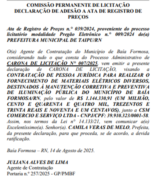 A contratação foi ratificada pela Prefeita Camila Veros de Lima (MDB), através do Processo Administrativo nº 2542/2025, Modalidade CARONA Nº 007/2025, referente a Ata de Registro de Preços n° 039/2024, proveniente do processo licitatório modalidade Pregão Eletrônico n° 009/2024 da PREFEITURA MUNICIPAL DE TAIPU/RN, no valor de R$ 1.144.330,91 (UM MILHÃO, CENTO E QUARENTA E QUATRO MIL, TREZENTOS E TRINTA REAIS E NOVENTA E UM CENTAVOS).
