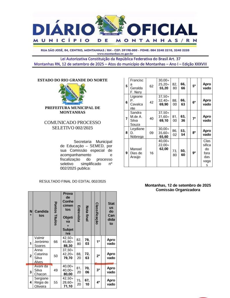 De acordo com informações publicadas pelo Diário Oficial, Anna Catarina ficou em segundo lugar no Processo Seletivo nº 002/2025, realizado para escolha de gestores escolares da rede municipal medida adotada em atendimento às diretrizes do Ministério da Educação (MEC), dentro da política de gestão democrática nas escolas.