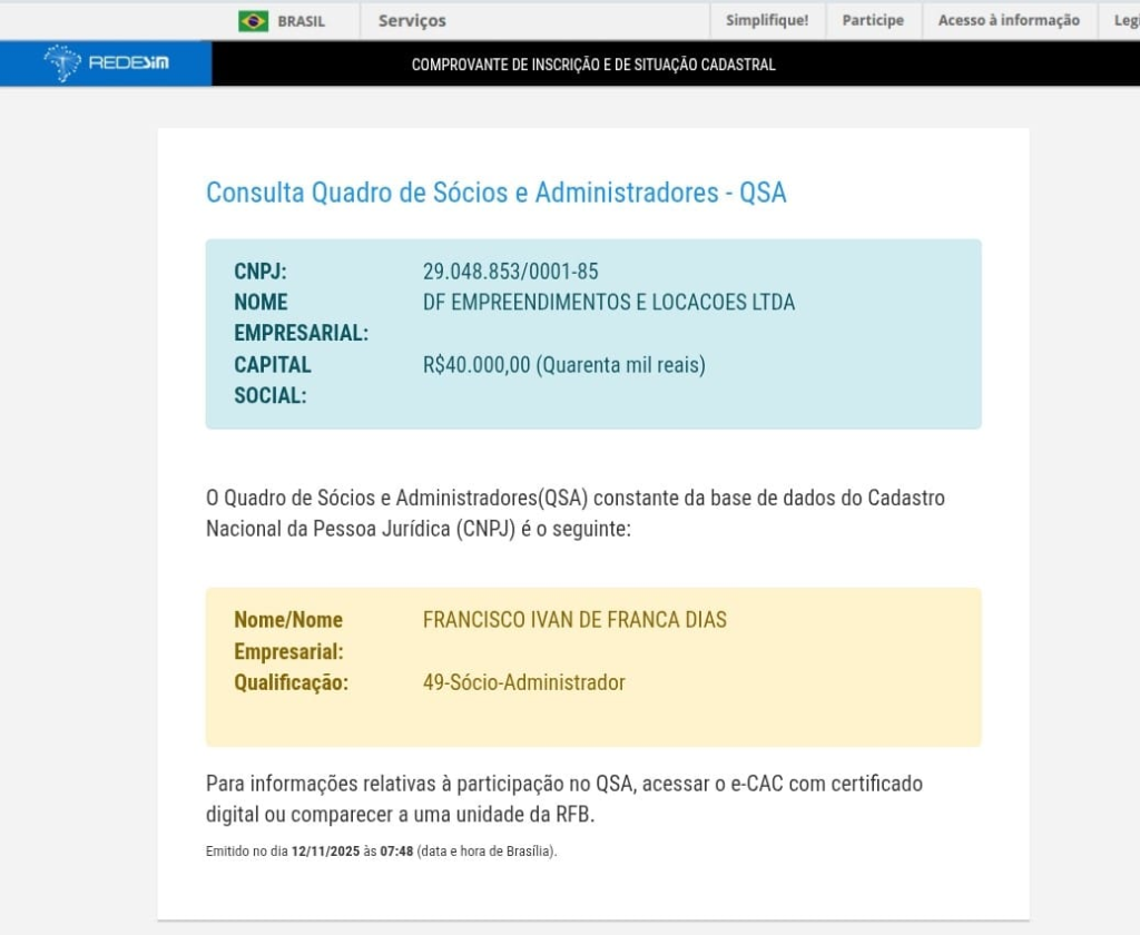 A DF EMPREENDIMENTOS E LOCAÇÕES tem como endereço cadastrado na Receita Federal do Brasil, a Rua Padre Felix, n°115, no município de Angicos/RN, e tem como proprietário, o senhor Francisco Ivan de França Dias, ex-secretário de transportes do referido município.