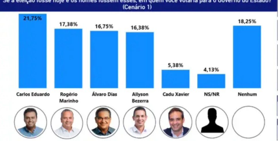 No Cenário 1, que reúne os principais nomes cotados para a disputa, o ex-prefeito Carlos Eduardo (PSD) aparece na liderança, com 21,75% das intenções de voto. Em seguida, surgem Rogério Marinho (PL), com 17,38%, Álvaro Dias (Republicanos), com 16,75%, e Allyson Bezerra (UB), com 16,38%, configurando um empate técnico entre os três. O pré-candidato Cadu Xavier (PT) registra 5,38%. A opção “Nenhum” soma 18,25%, enquanto 4,13% dos entrevistados não souberam ou não responderam.