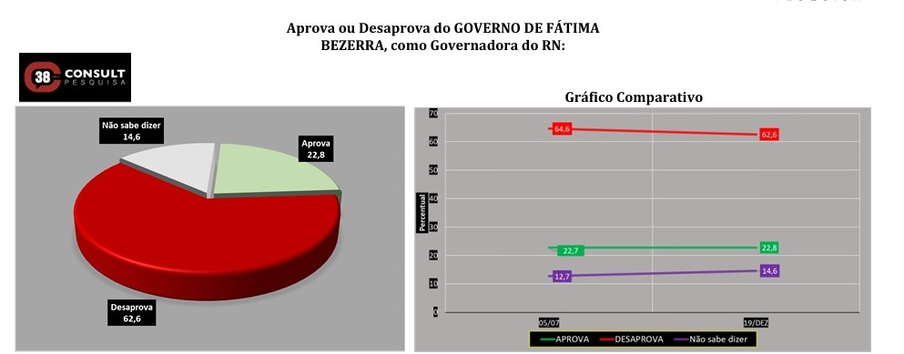 Pesquisa realizada pelo Instituto Consult, em parceria com a Tribuna do Norte, mostra que 62,6% dos eleitores de Natal desaprovam a gestão da governadora Fátima Bezerra (PT). De acordo com o levantamento, 22,8% aprovam a administração estadual, enquanto 14,6% não souberam ou não responderam.