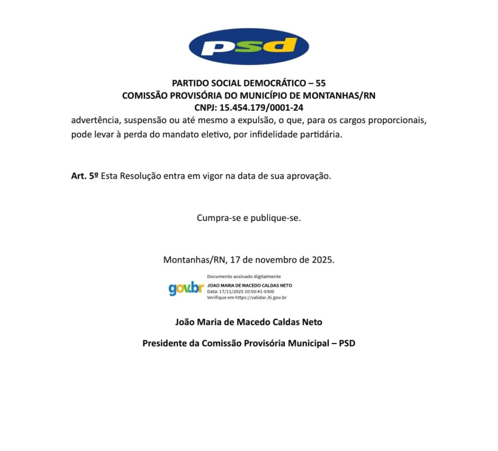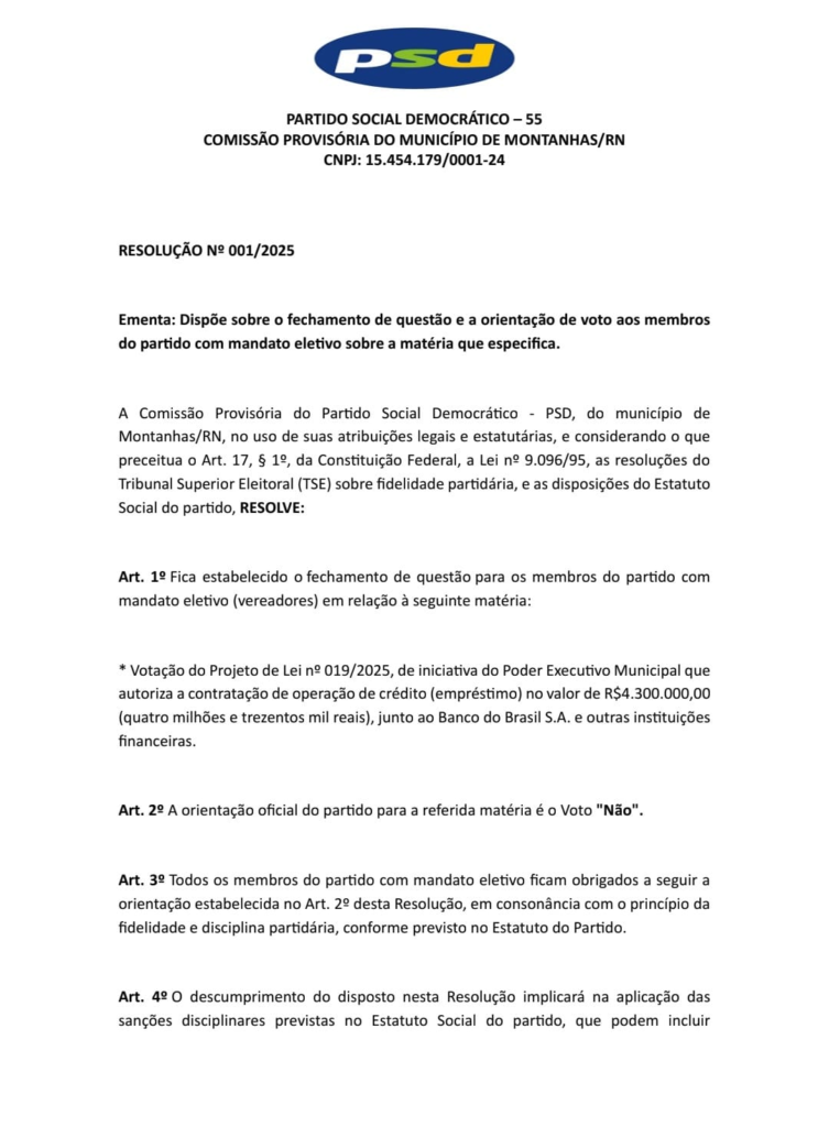 O Partido Social Democrático do município de Montanhas/RN, emitiu uma resolução partidária estabelecendo o fechamento de questão para os membros do partido, detentores de mandato eletivo (vereadores) em relação a votação do PL 019/2025, de iniciativa do poder executivo, que autoriza a contratação de operação de crédito (empréstimo) no valor de R$4.300.000,00 (quatro milhões e trezentos mil reais).