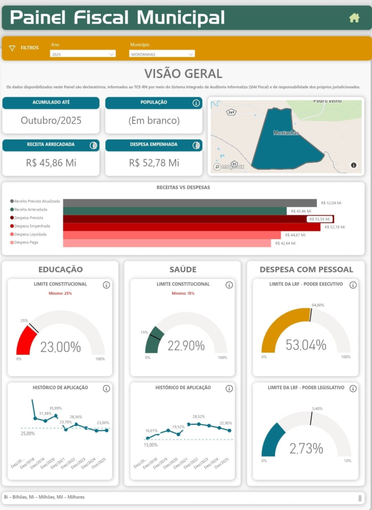 Outro ponto crítico destacado no relatório diz respeito às despesas com pessoal. Montanhas já comprometeu 53,04% da Receita Corrente Líquida, ultrapassando o limite de alerta da Lei de Responsabilidade Fiscal (LRF).