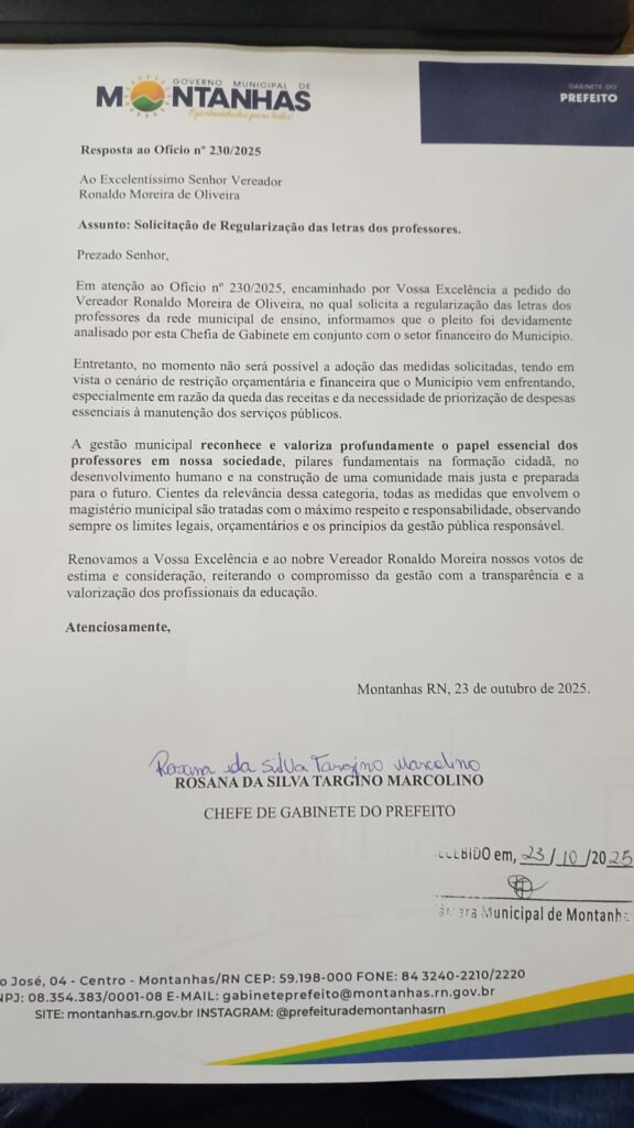 A resposta foi encaminhada à Câmara Municipal de Montanhas/RN em 23 de outubro, e assinada pela Senhora Rosana da Silva Targino Marcolino, que é nora do prefeito e exerce o cargo de Chefe de Gabinete do Prefeito.