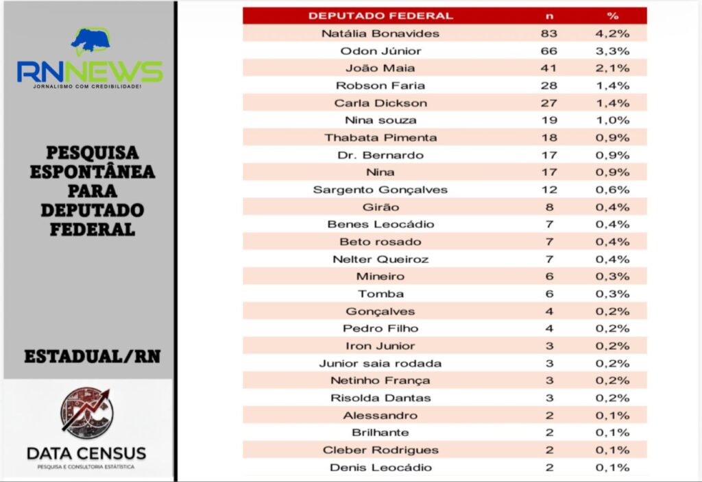 Natália Bonavides, Odon Júnior, João Maia, Robson Faria, Carla Dickson, Nina Souza, Thabata Pimenta e Dr. Bernardo, são os 8 mais citados para as 8 cadeiras disponíveis na câmara federal.