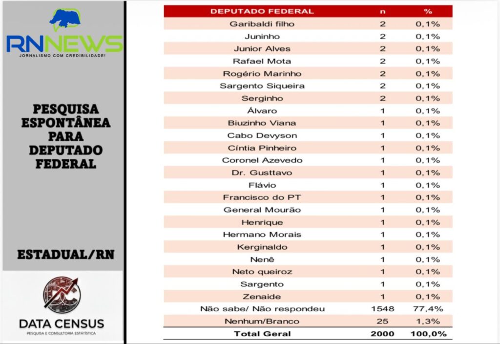 A pesquisa do RN News, em parceria com a Data Census, mostra como está a disputa na corrida para deputado federal do RN.