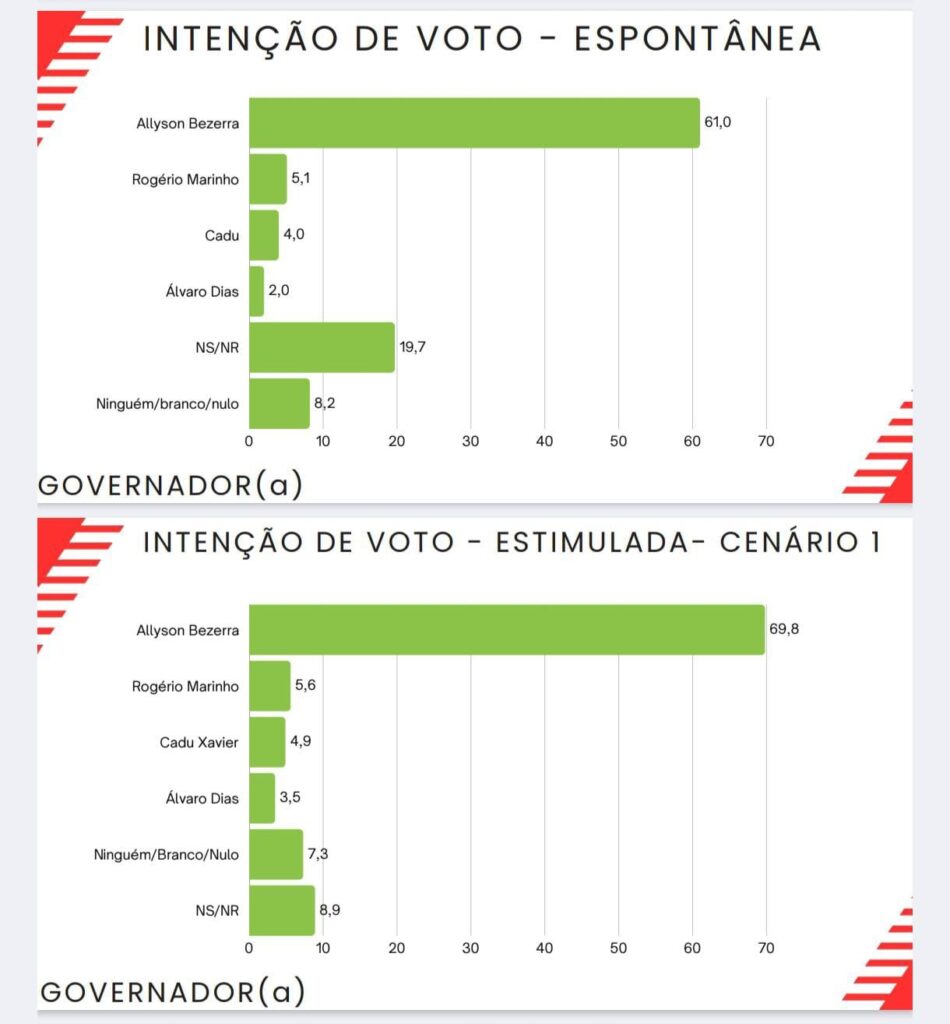 A pesquisa do Instituto Seta, realizada com eleitores de Mossoró, indica um cenário de forte vantagem do prefeito Allyson Bezerra na disputa pelo Governo do Rio Grande do Norte. Na intenção de voto espontânea, Allyson aparece com 61%, demonstrando alto grau de lembrança e consolidação eleitoral no município. Bem atrás surgem Rogério Marinho (5,1%), Cadu (4,0%) e Álvaro Dias (2,0%). Os índices de NS/NR (19,7%) e ninguém/branco/nulo (8,2%) finalizam o balanço colhido.