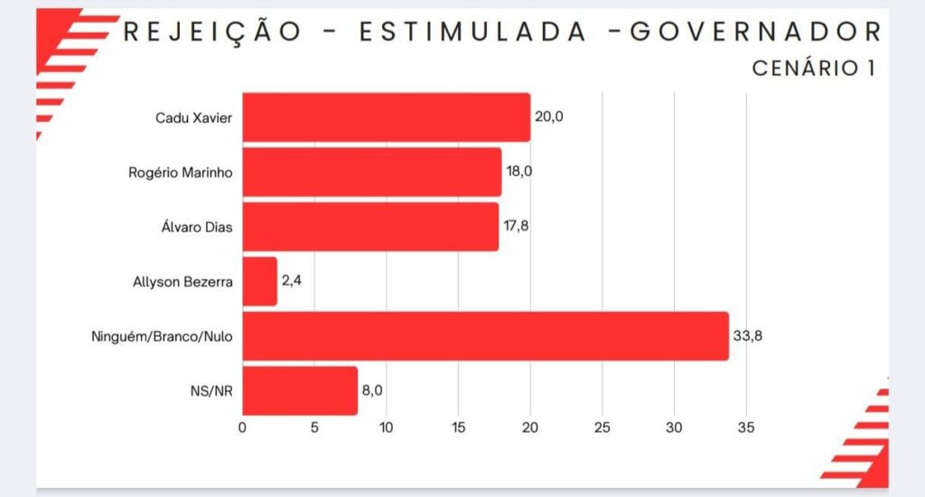 O levantamento de rejeição estimulada ajuda a explicar a explicação desse desequilíbrio eleitoral. Cadu Xavier lidera a rejeição, com 20%, seguido por Rogério Marinho (18%) e Álvaro Dias (17,8%). Allyson Bezerra apresenta rejeição residual, de apenas 2,4%, o que indica amplo espaço de crescimento e baixo teto negativo. No conjunto, os dados mostram que, neste momento, a corrida pelo Governo do RN em Mossoró é amplamente dominada por Allyson Bezerra, com os demais pré-candidatos distantes e enfrentando maior resistência do eleitorado.