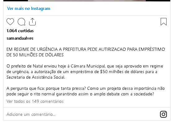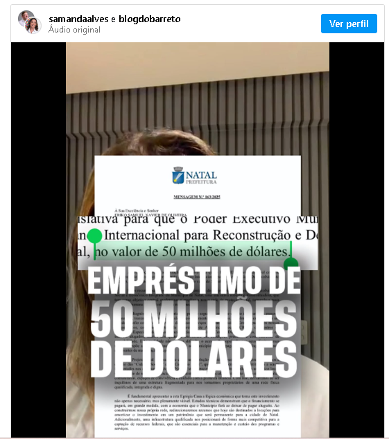 O prefeito de Natal, Paulinho Freire (União Brasil), enviou à Câmara Municipal um projeto de lei com pedido de urgência para autorizar um empréstimo de 50 milhões de dólares. Parte dos recursos deverá ser administrada pela Secretaria Municipal de Assistência Social, comandada pela vereadora licenciada Nina Souza, esposa do prefeito e pré-candidata a deputada federal.