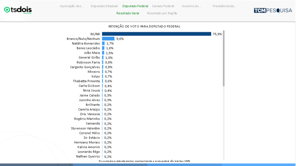 A pesquisa TCM/TSDois ouviu 1.831 eleitores em 68 municípios do Rio Grande do Norte. A margem de erro de 2,3 pontos percentuais para mais ou para menos com nível de confiança de 95%.
