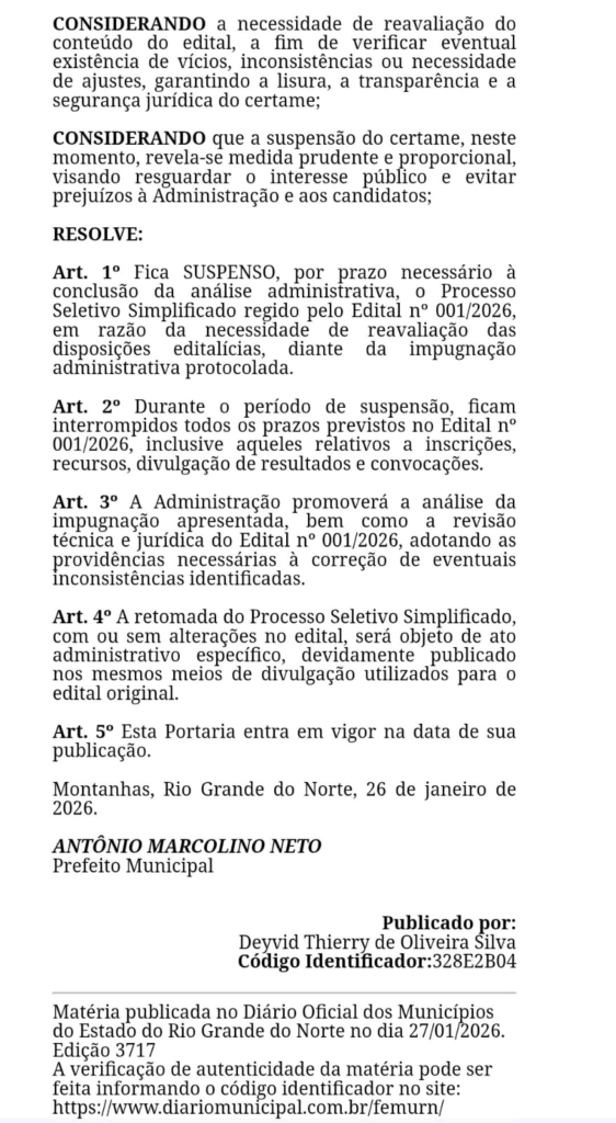 A impugnação foi acatada pelo prefeito Antônio Marcolino Neto, através da Portaria n° 043/2026, publicada no Diário Oficial dos Municípios do Rio Grande do Norte – FEMURN, em 27/01/2026.