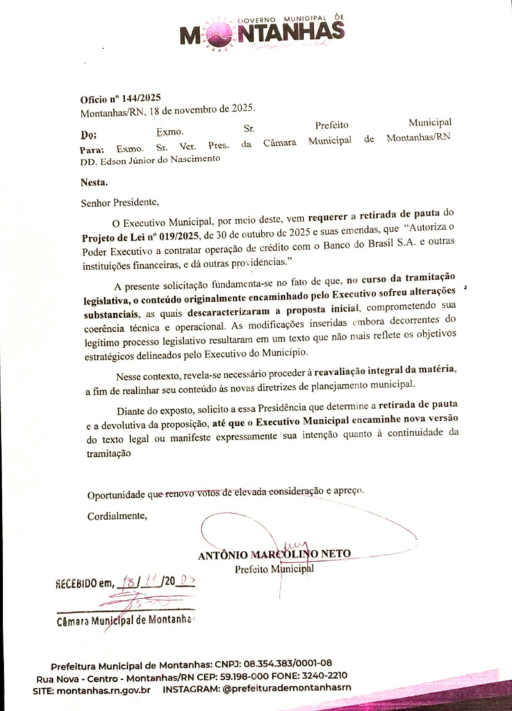 O prefeito Antônio Marcolino Neto (PP) solicitou a retirada do Projeto de Lei Municipal 019/2025, da pauta de votação que estava prevista para esta manhã (19), na Câmara Municipal de Montanhas/RN.
