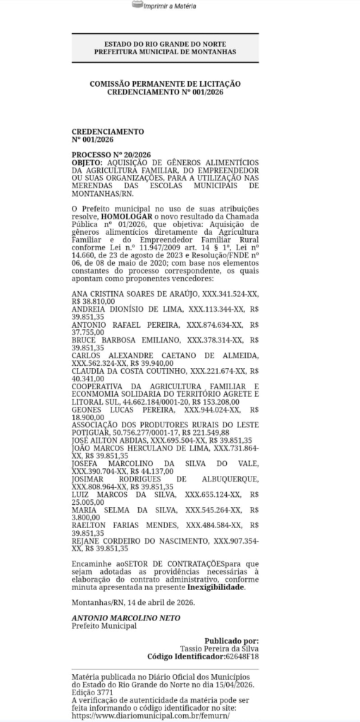 A chamada Pública foi homologada pelo prefeito Antônio Marcolino Neto em 14 de abril de 2026, e aponta entre os vencedores, a COOPERATIVA DA AGRICULTURA FAMILIAR E ECONOMIA SOLIDARIA DO TERRITÓRIO AGRESTE E LITORAL SUL, situada no município de Canguaretama e a ASSOCIAÇÃO DOS PRODUTORES RURAIS DO LESTE POTIGUAR, localizada na cidade de São José de Mipibú, região metropolitana de Natal.