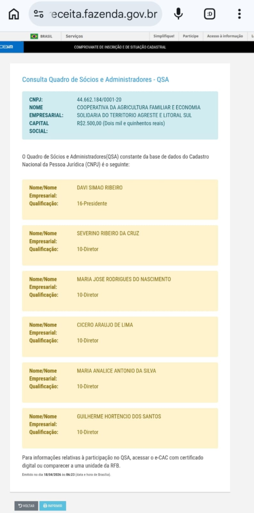 A COOPERATIVA DA AGRICULTURA FAMILIAR E ECONOMIA SOLIDARIA DO TERRITÓRIO AGRESTE E LITORAL SUL, de Canguaretama, possui um capital social de apenas R$2.500 reais, segundo informações da Receita Federal do Brasil, mas foi contemplada com o valor de R$153.208,00.